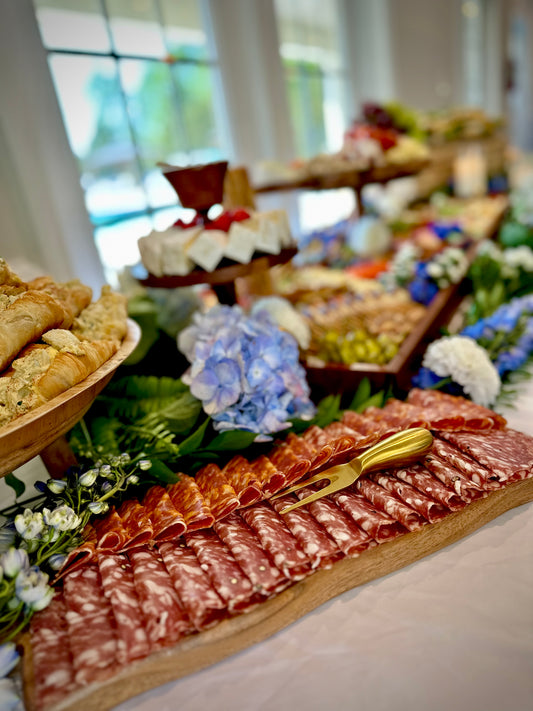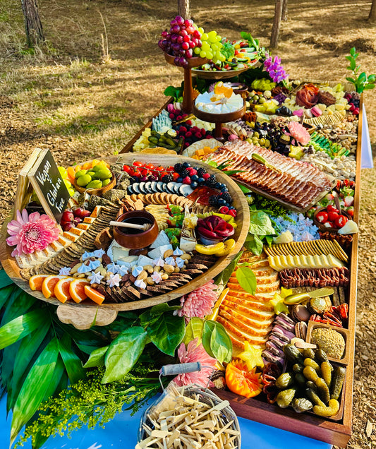 An exquisite grazing experience designed for the most discerning hosts. This premier presentation transforms a traditional graze into a work of art — featuring a curated selection of the finest artisan cheeses, charcuterie, and gourmet accompaniments. Styled with layered risers, lush seasonal florals, cascading greenery, ambient candlelight, and refined décor elements, The Artisan Grand Grazer delivers a striking visual impact with an air of effortless elegance. Perfect for weddings, galas, and upscale celebrations where only the best will do.