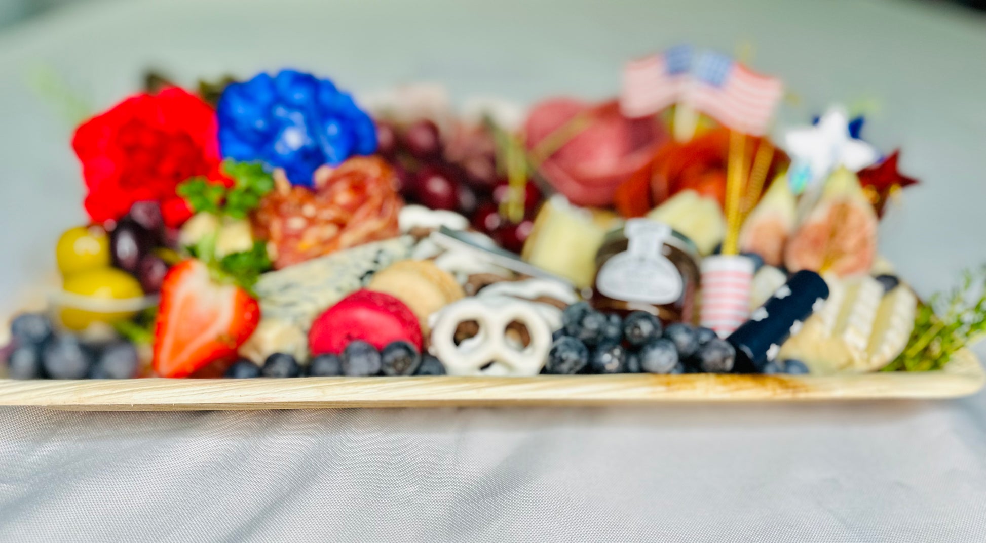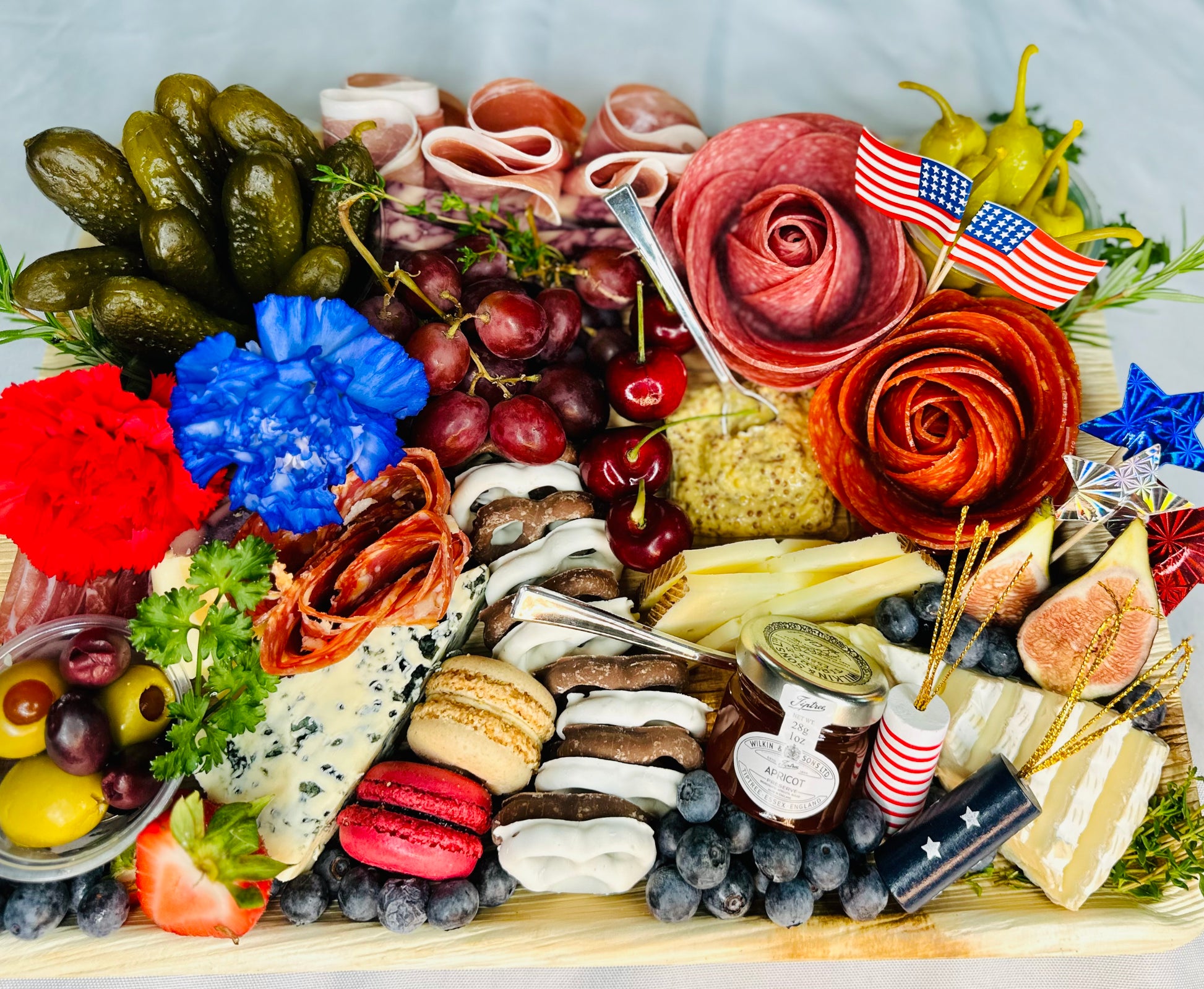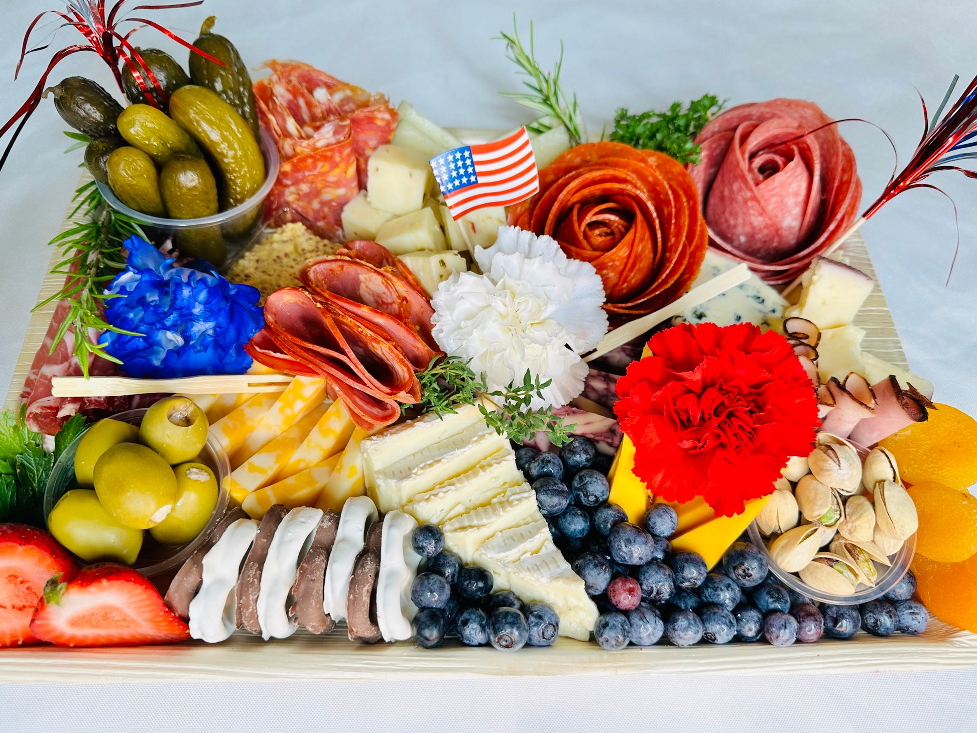Our 4th of July Festive Boards and Fruit Platters are beautifully arranged with patriotic colors, featuring gourmet meats, artisan cheeses, fresh berries, and festive accents like star-shaped cheeses and red, white, and blue treats. Perfect for holiday gatherings, these boards and platters offer a delicious and visually stunning way to celebrate Independence Day!
