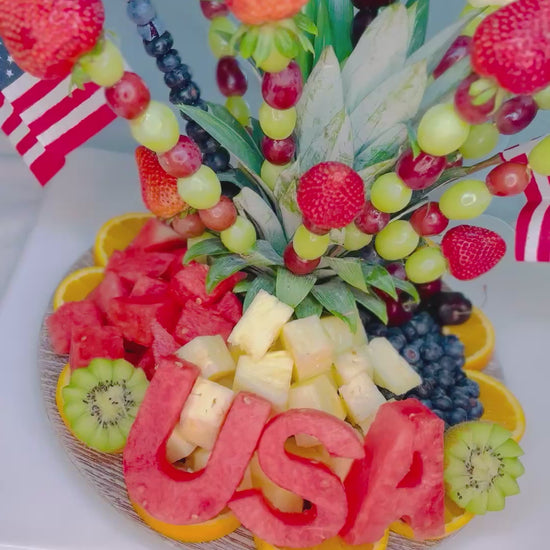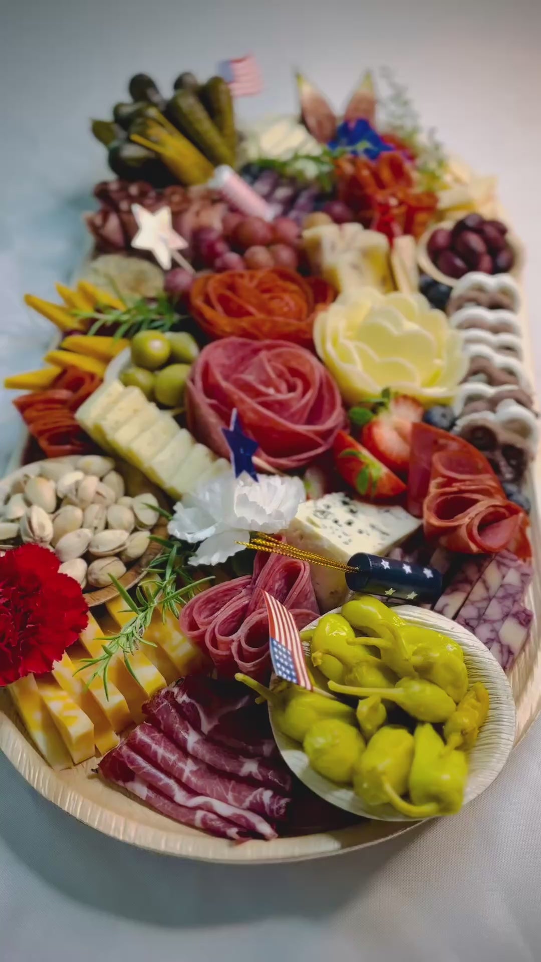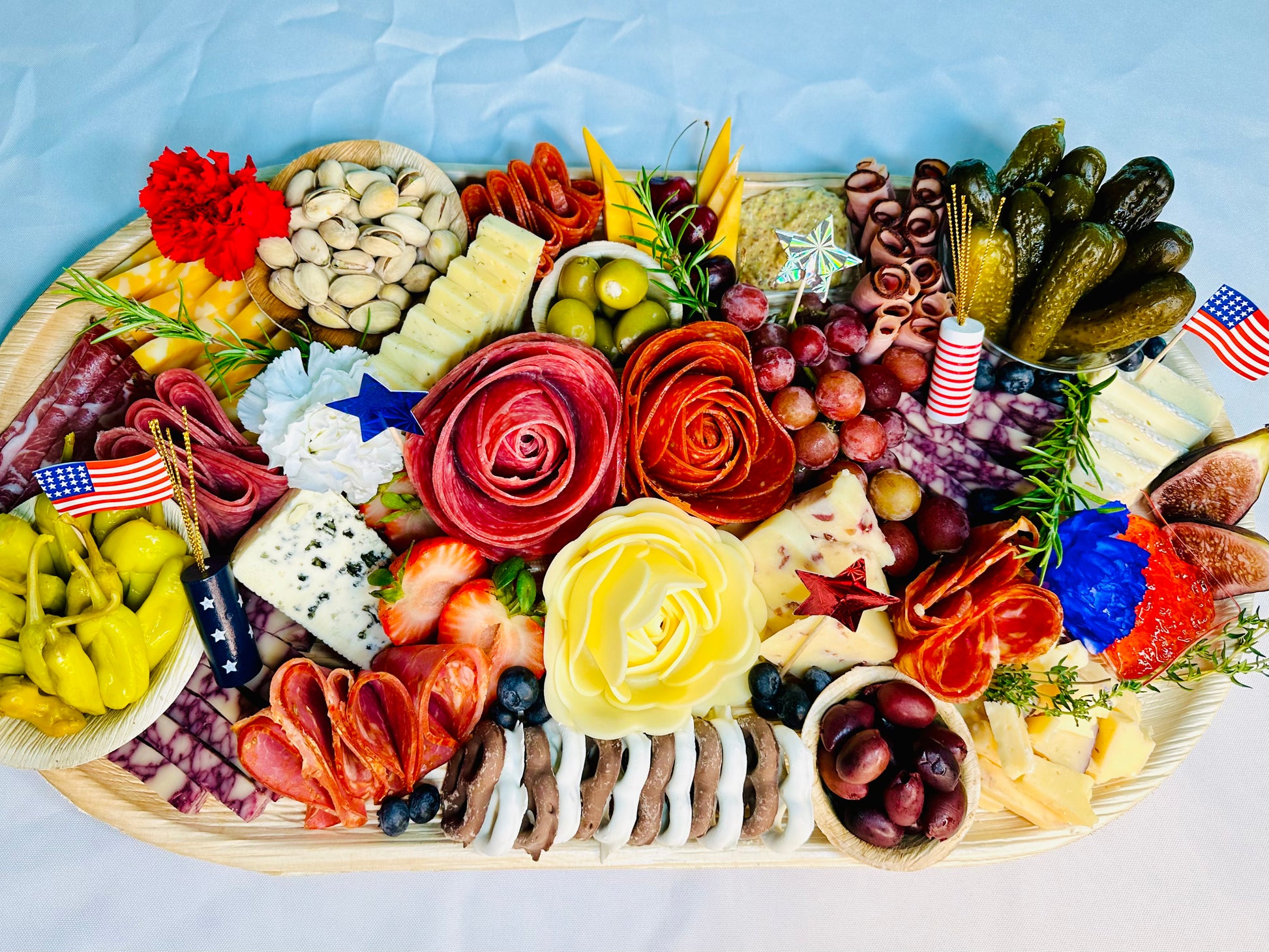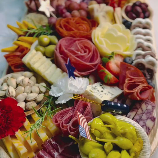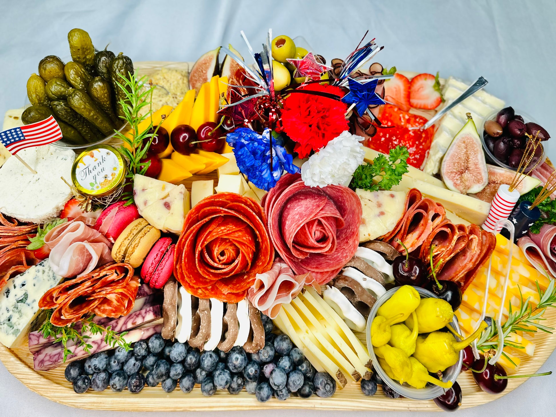 Our 4th of July Festive Boards and Fruit Platters are beautifully arranged with patriotic colors, featuring gourmet meats, artisan cheeses, fresh berries, and festive accents like star-shaped cheeses and red, white, and blue treats. Perfect for holiday gatherings, these boards and platters offer a delicious and visually stunning way to celebrate Independence Day!