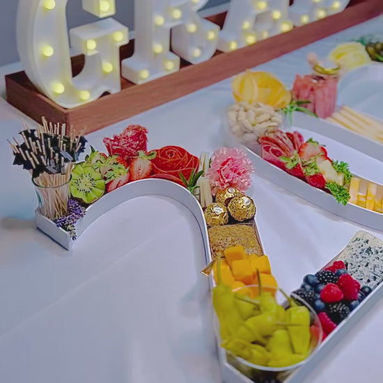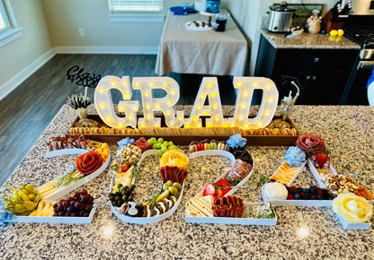 Our Graduation Boards and Graduation Year Boards are the perfect way to celebrate your graduate with a stunning and delicious display of gourmet meats, artisan cheeses, fresh fruits, and savory accompaniments. The Graduation Year Boards are available in two sizes—year (last two digits) and full year (all four digits)—carefully arranged to showcase the milestone in an eye-catching way. Each board is decorated in school colors using themed accents, fresh florals, and coordinating garnishes for a personalized touch. For an extra special touch, add on marquee lights to illuminate the display and create a show-stopping centerpiece for the celebration!