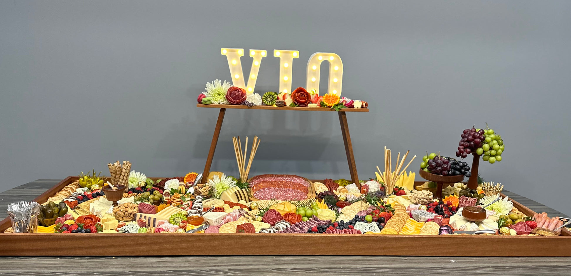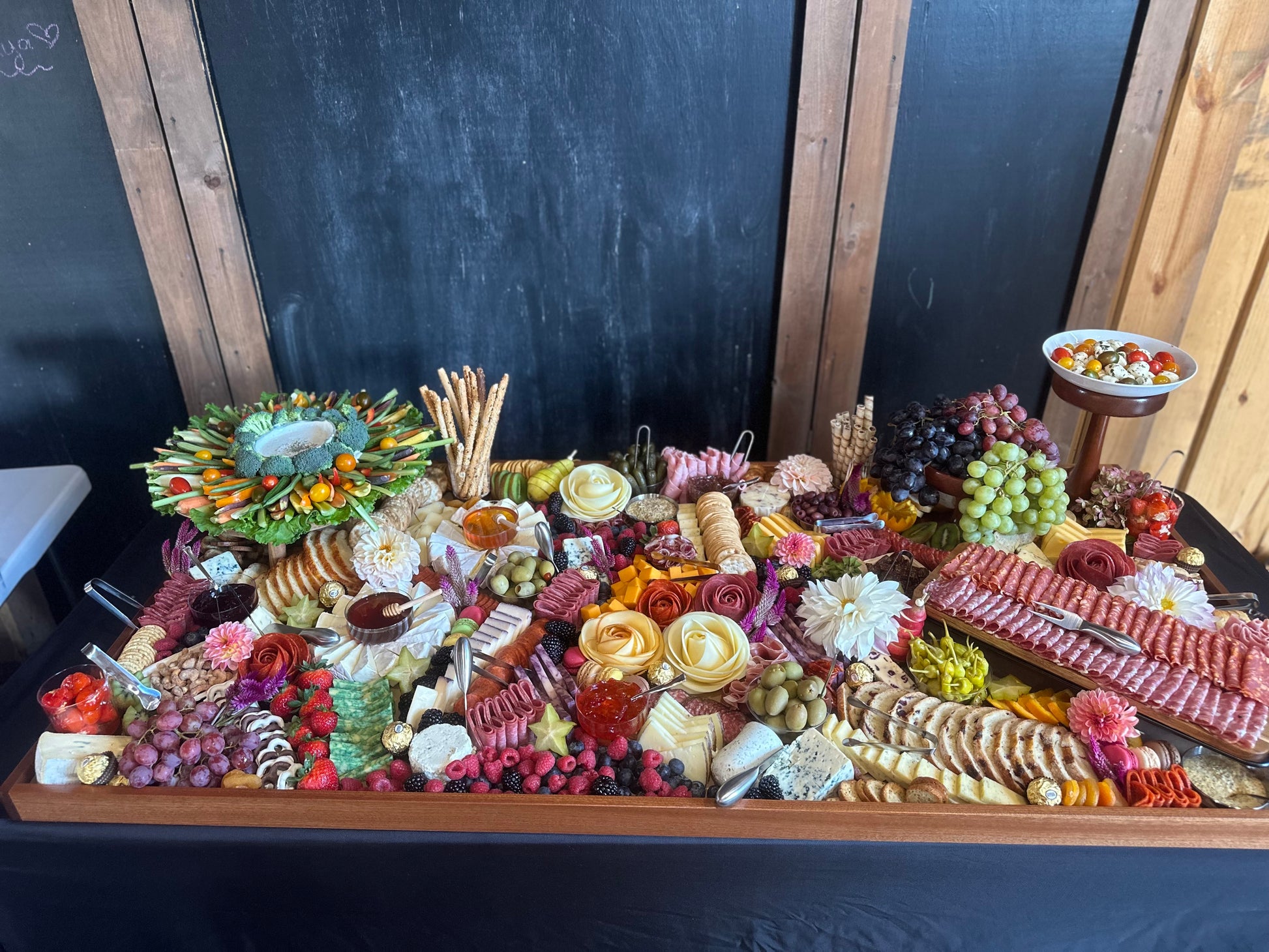 BozaBoards’ 6ft x 30in graze table is an expansive and beautifully crafted spread, designed to feed 70–80 guests. Ideal for large gatherings, weddings, corporate events, milestone celebrations, and other significant occasions, this table offers a bountiful selection of artisan cheeses, premium cured meats, fresh and dried fruits, nuts, olives, honey, specialty dips, and an assortment of crackers and fresh bread.