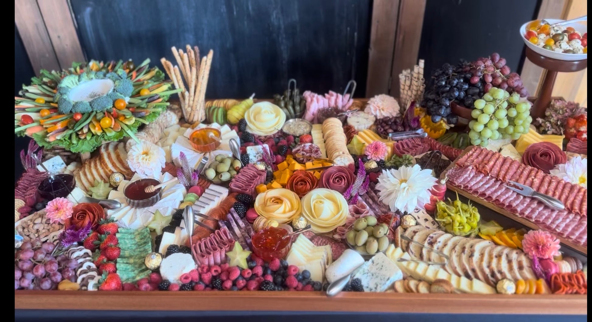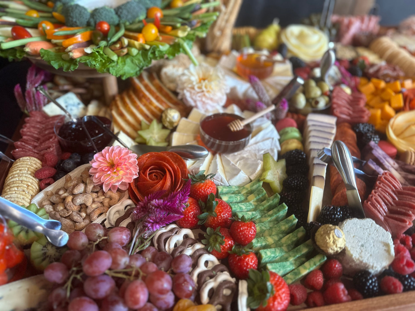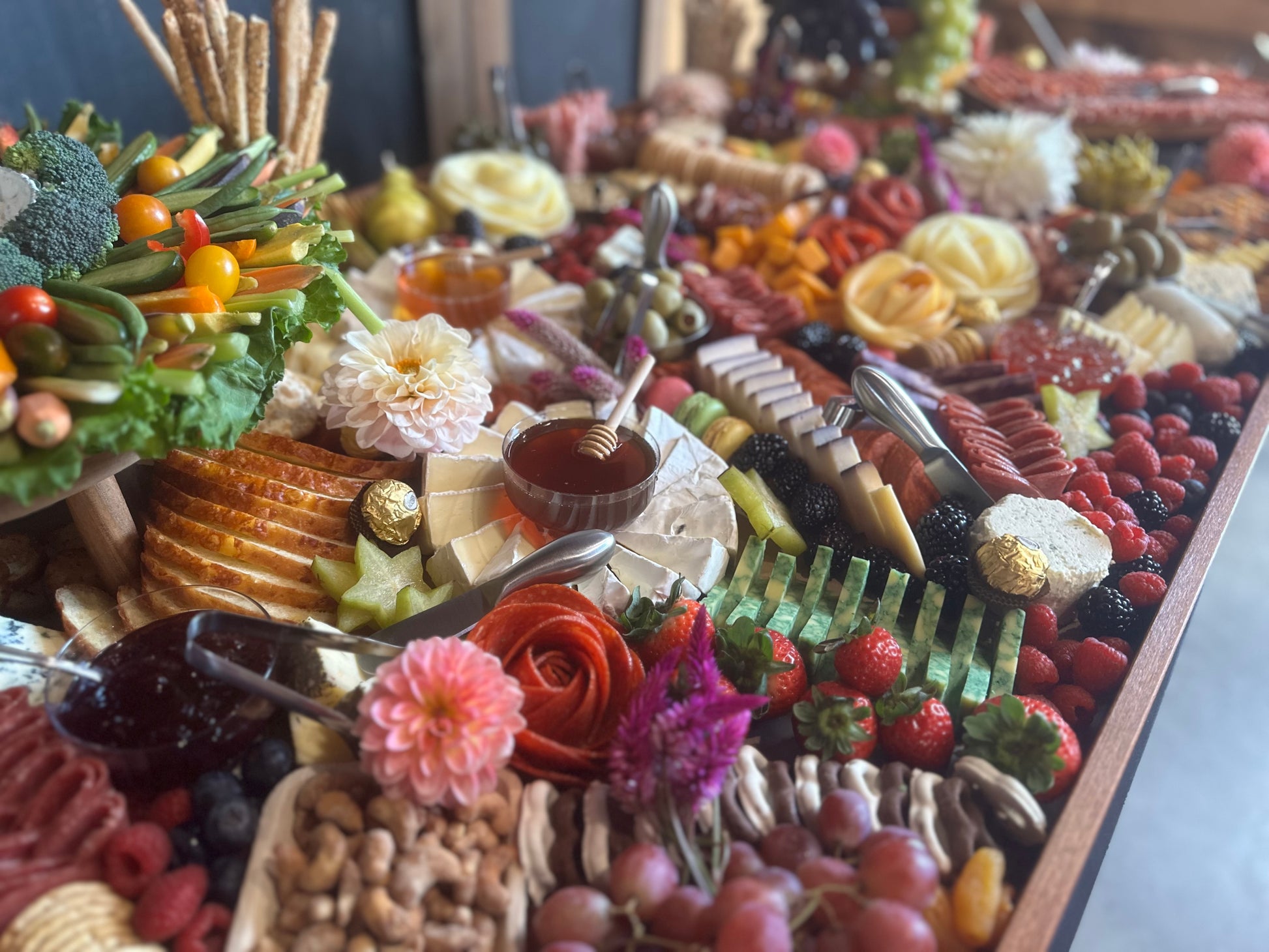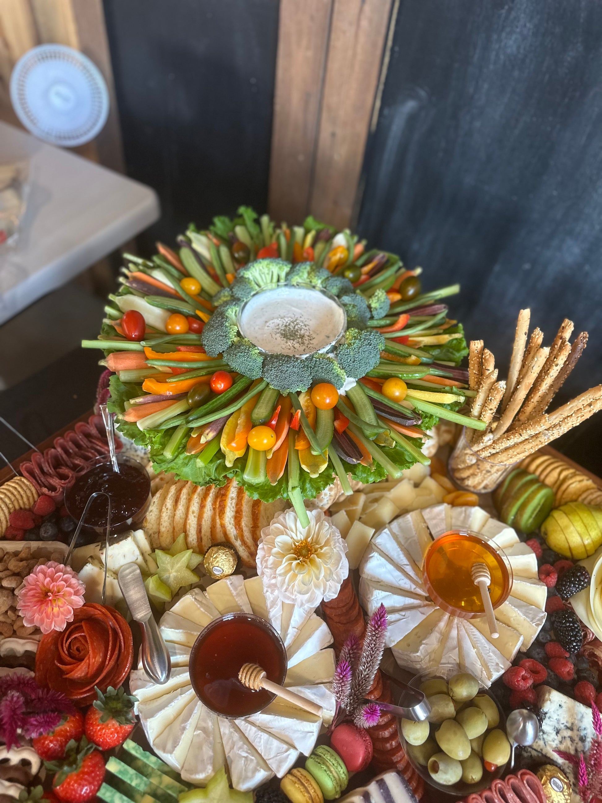 Styled with seasonal accents, fresh florals, and elegant garnishes, this table creates a stunning visual focal point while providing a delicious, diverse array of flavors for guests to enjoy. Carefully arranged to encourage mingling and easy grazing, it ensures that everyone can enjoy the perfect balance of sweet, savory, and crunchy elements.