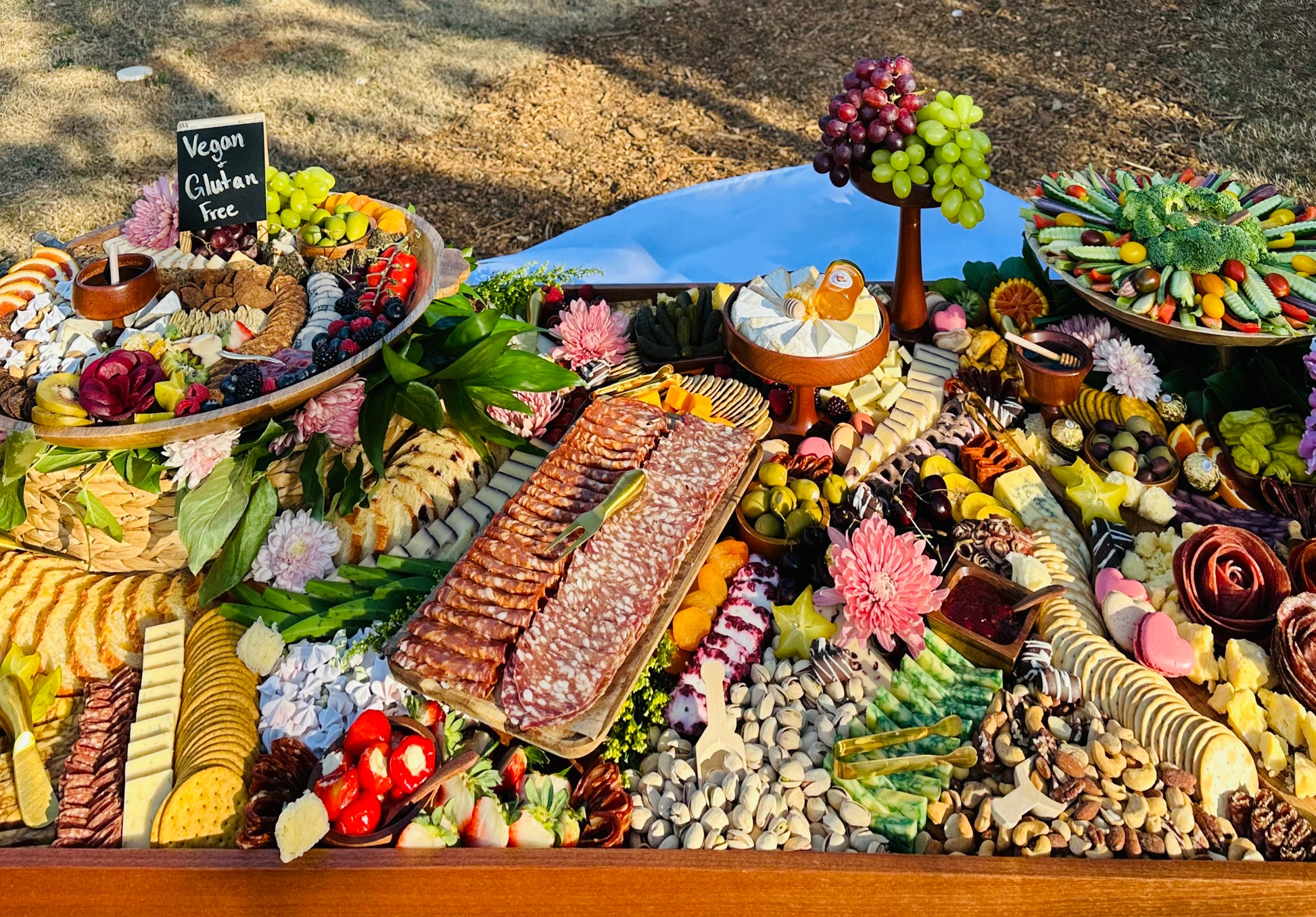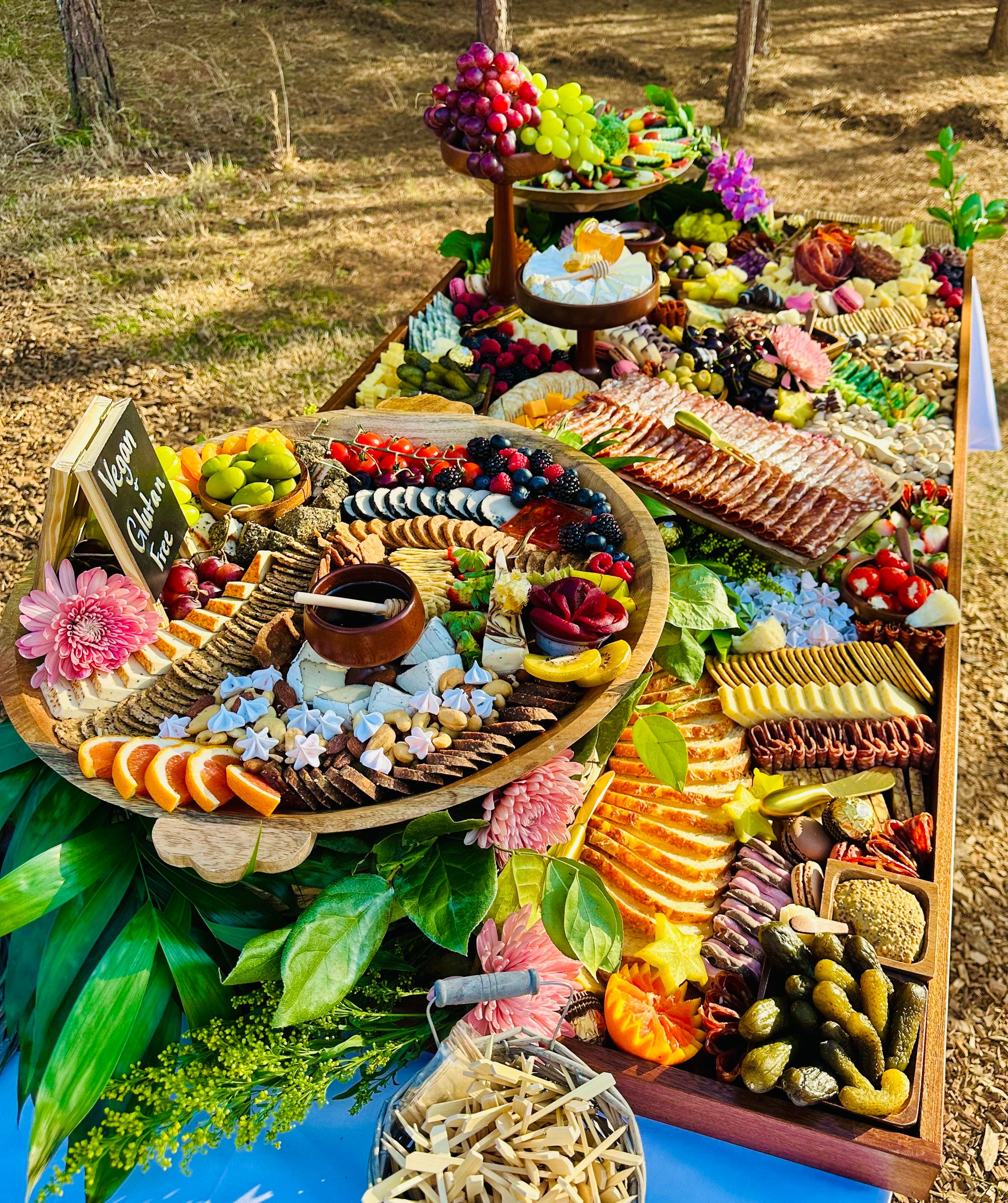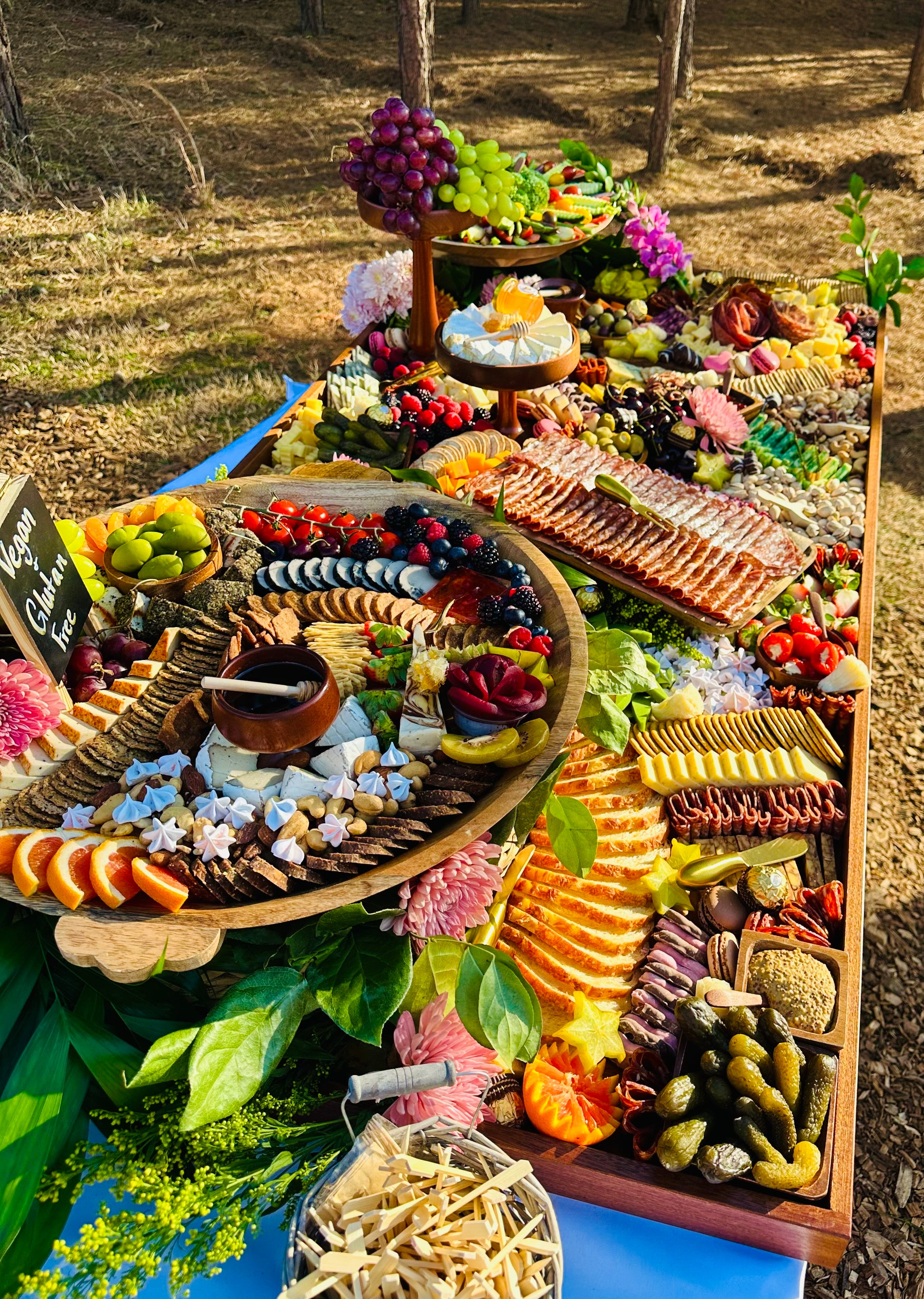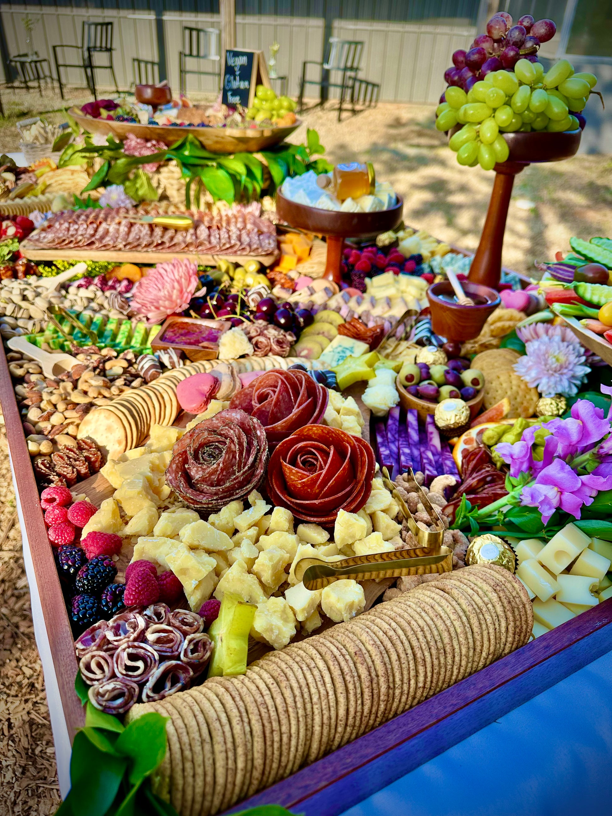 BozaBoards’ 7ft x 18in graze table is a grand and visually stunning spread, designed to feed 60-70 guests. Perfect for large gatherings, weddings, corporate events, milestone celebrations, and other significant occasions, this table features an extensive selection of artisan cheeses, premium cured meats, fresh and dried fruits, nuts, olives, honey, specialty dips, and an assortment of crackers and fresh bread.