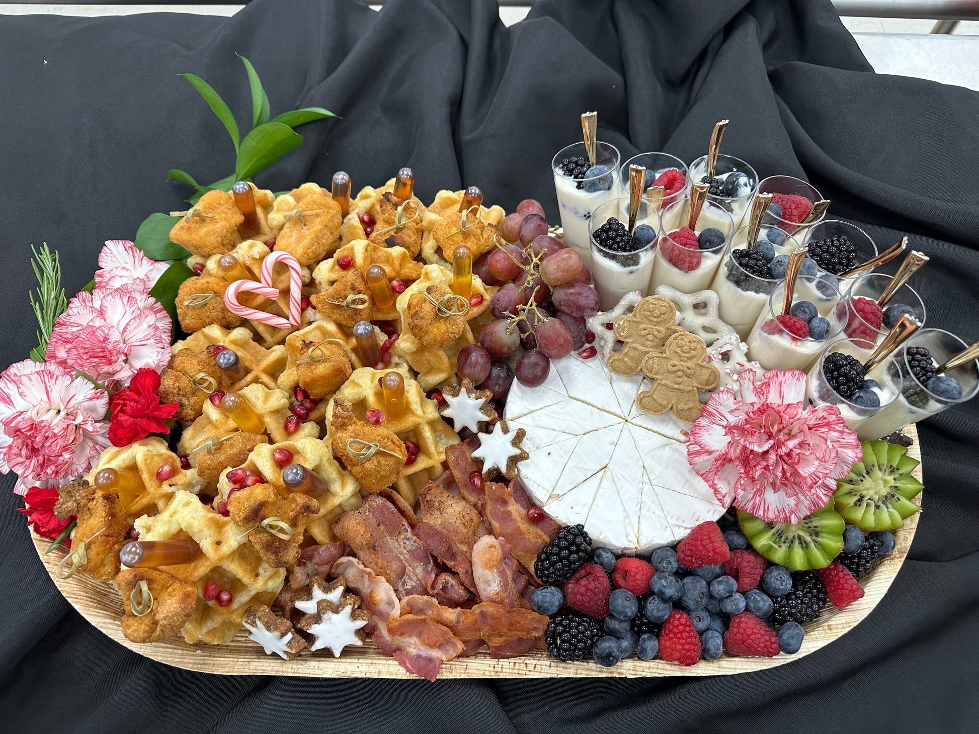 12 Count- Mini skewers of crispy chicken and fluffy waffles, served with a jar of BozaBoards’ signature hot honey and a honeycomb drizzle stick – sweet, savory, and totally shareable.